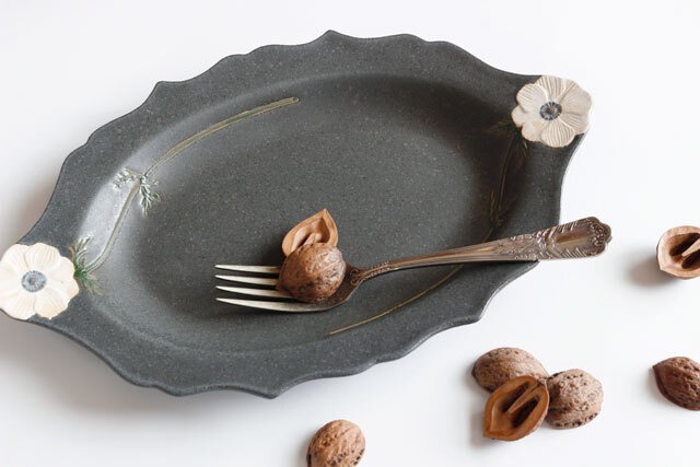 チャコールアネモネの楕円皿大 陶器 よしざわ窯