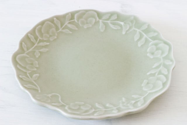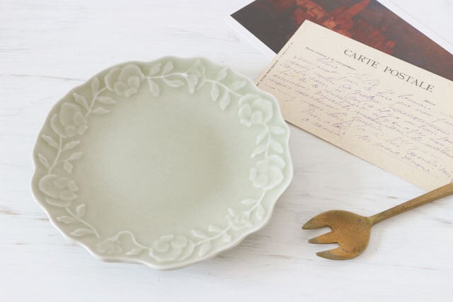 お花のやさしいデザインに、美しい翡翠色がそっと重なり上品さと可愛らしさをあわせ持つ、とっておきの一皿です。