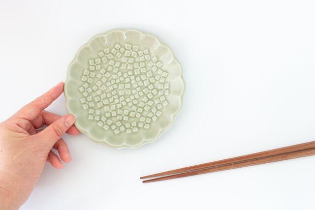 表面の凹凸によって生まれる陰影があじさいの繊細な美しさを引き出し日々の食卓に華やぎを添えます。