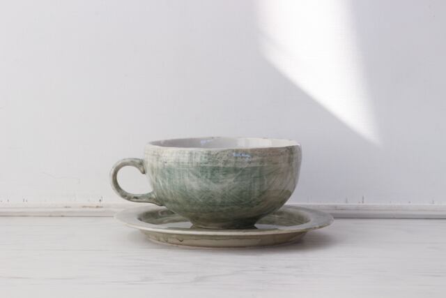 ペンキで描いたような線が特徴のシャビーグリーンのカップ。