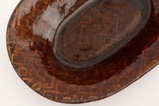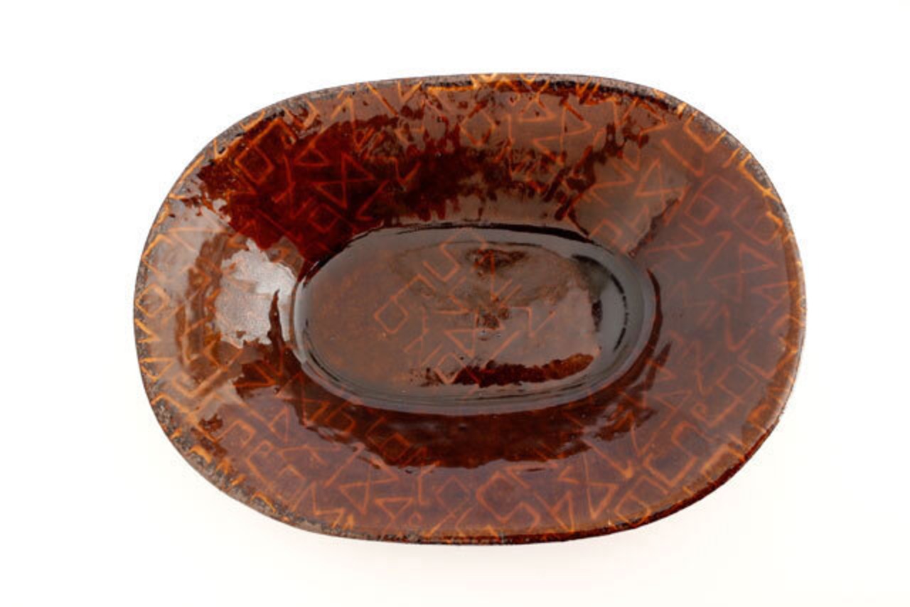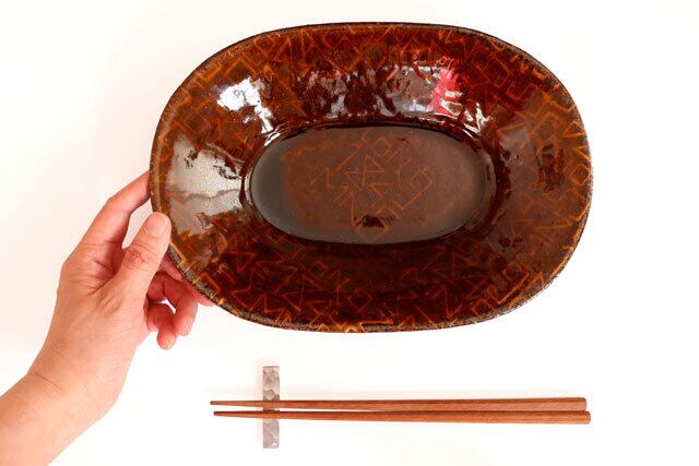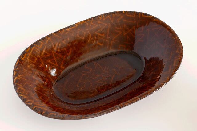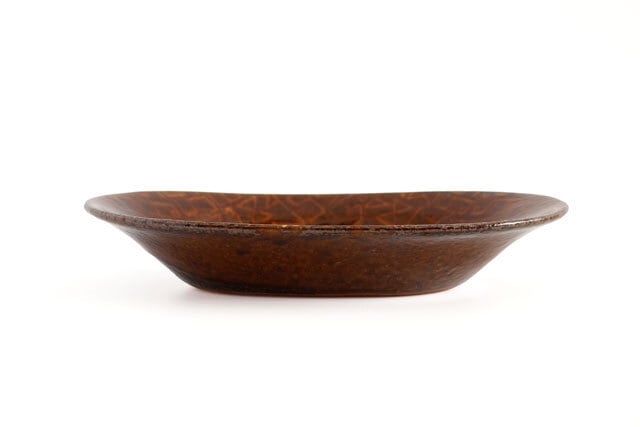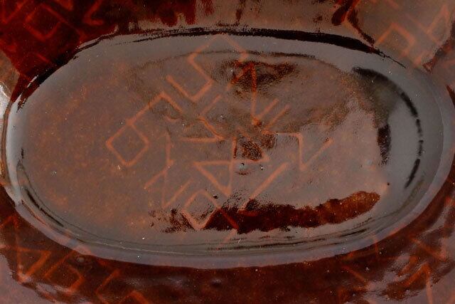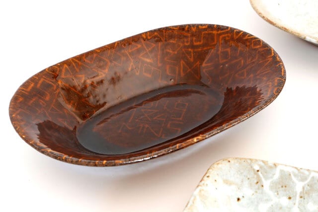 艶やかな飴色のお皿に、どこか見覚えのある模様が浮かび上がる作家物の器です。