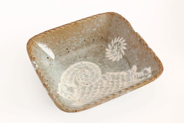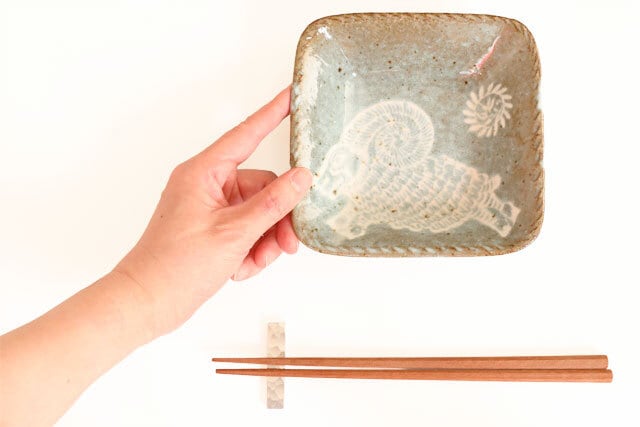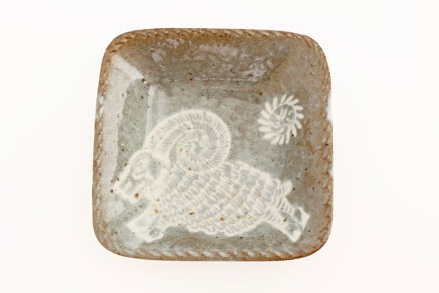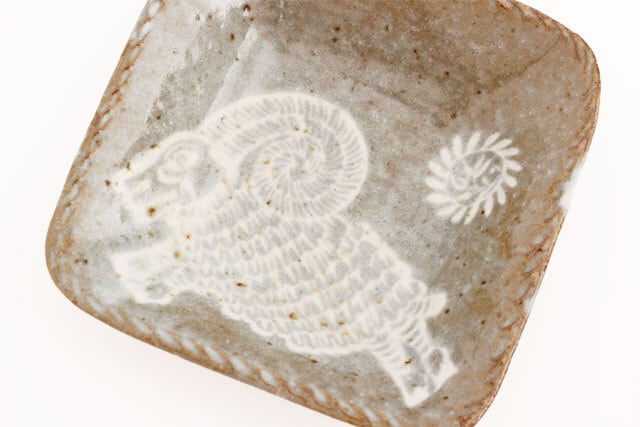 中央にゆったりと佇む山羊の模様が目を引く作家物の器です。