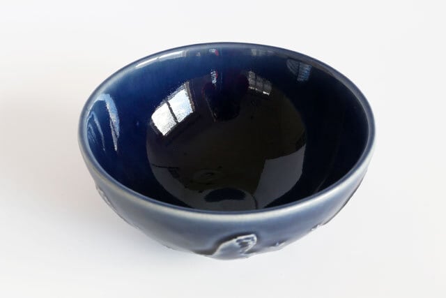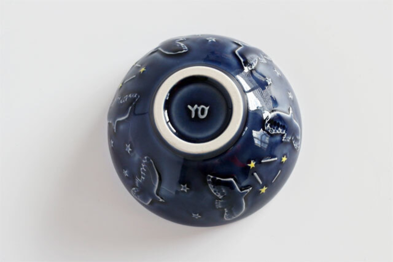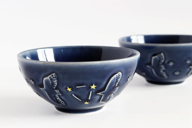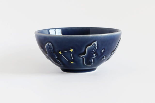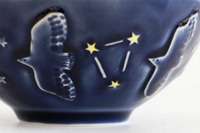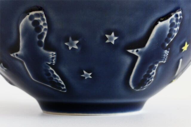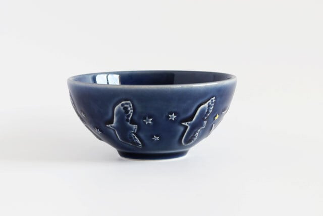 夜空を舞う鳥とそっと瞬く星々が描かれた藍色のお茶碗。