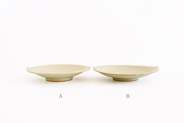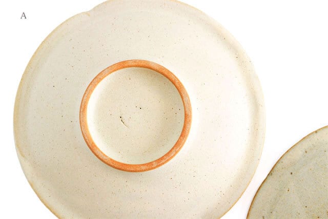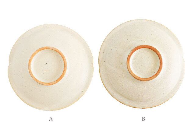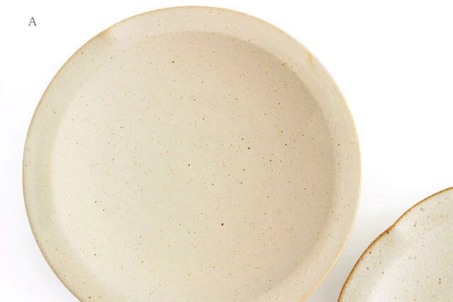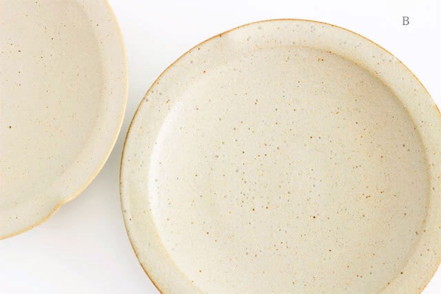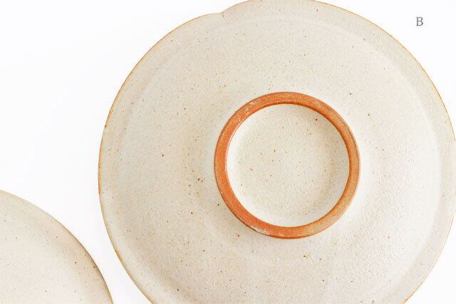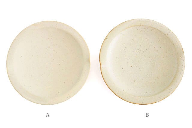 B:全体的に鉄粉が見られ、縁なども素地の茶色がのぞいていたり、やき物らしい雰囲気を楽しんでいただけます。