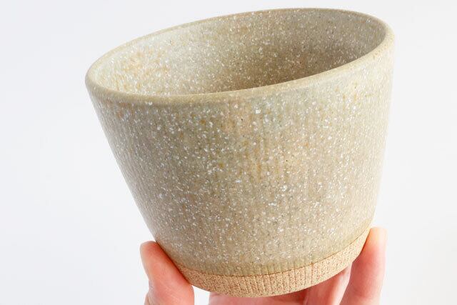 ベースの落ち着いたグレージュに、白やグレー、ブラウンの点が全体に広がっていて、焼き物らしい奥行きのある個性を感じさせてくれます。