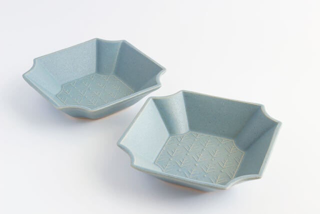 器の底に広がる、杉の葉をモチーフにしたcedarpatternがポイント。隅を切り落とした「隅切型」のフォルムは、食卓に柔らかなリズムと華やかさを生み出します。