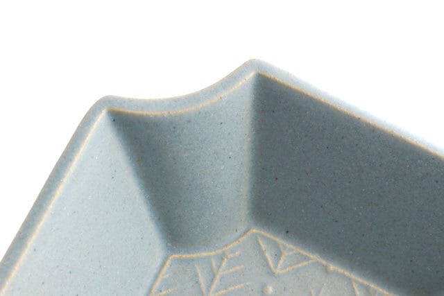 底面に杉の葉をイメージした「cedarpattern」が施された隅切型の器。くすんだマットなブルーグレーの色味、隅切りの形、そしてナチュラルなパターン模様。可愛いが詰まった器です!ナチュラルな雰囲気がお好きな方にも、北欧スタイルがお好きな方にもおすすです。