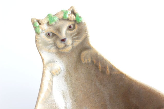シロツメクサを頭に乗せた猫のうつわ。物語性がたっぷりの何とも魅力的な作品です。醸し出す上品さは一目で心奪われる美しさ。繊細に表現されたシロツメクサの質感もぜひお手元でじっくりとお愉しみください。