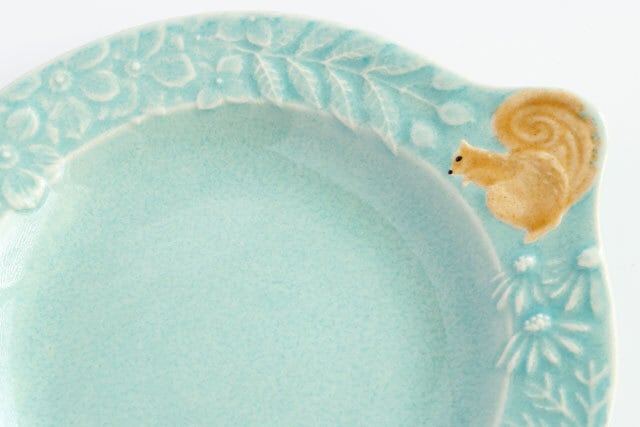 // リスが向かい合う「レイクグリーン」の小皿 //